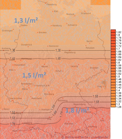 Von Mittwoch auf Donnerstag überquert uns teils schauerartiger Regen von West nach Ost. Die Niederschlagsmengen liegen an beiden Tagen meist zwischen 5 und 15 Liter pro Quadratmeter.