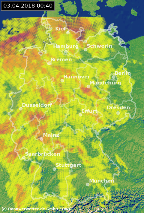 Das Radarbild zeigt aktuell verbreitet leichte bis mäßige Signale. Im Nordwesten, sowie in der Mitte fällt leichter Warmfrontregen. Sonst präsentiert sich der Himmel über Deutschland überwiegend wolkenverhangen. Nur im Süden und Osten zeigen sich stellenweise die Sterne.