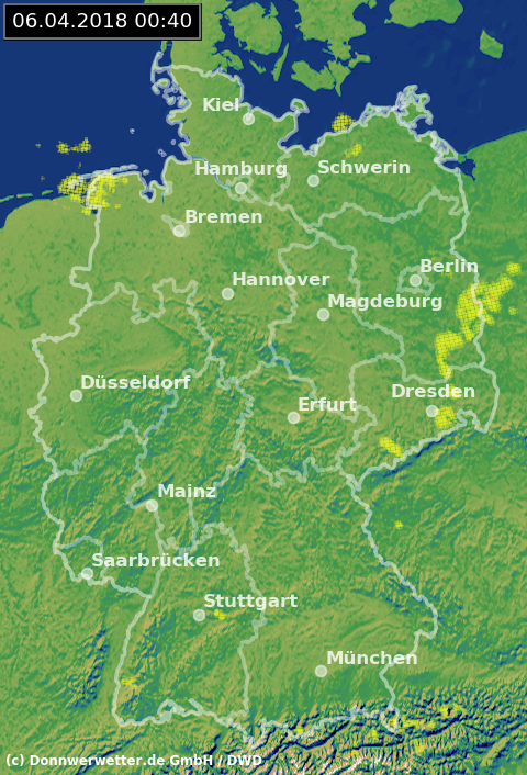 Das Radarbild zeigt aktuell im Osten und an den Alpen noch einige schwache Signale mit etwas Regen. Sonst präsentiert sich der Himmel über Deutschland schon häufiger aufgeklart.