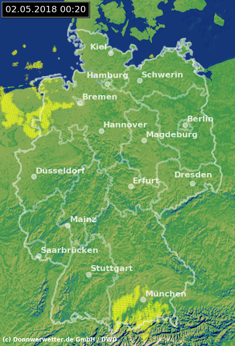 Das Radarbild zeigt aktuell zwar einige schwache Signale, Regen fällt jedoch nicht. Der Himmel über Deutschland präsentiert sich überwiegend sternenklar, oder nur leicht bewölkt. Lediglich im Alpenvorland halten sich dichtere Wolkenfelder.
