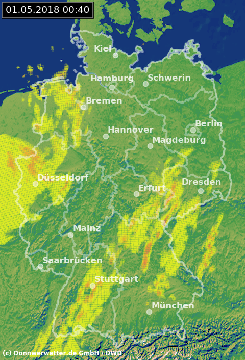 Das Radarbild zeigt aktuell noch einige Regen- und Schauersignale. Sonst präsentiert sich der Himmel in der Nordosthälfte von Deutschland überwiegend sternenklar, in der Südwesthälfte eher wolkenverhangen.
