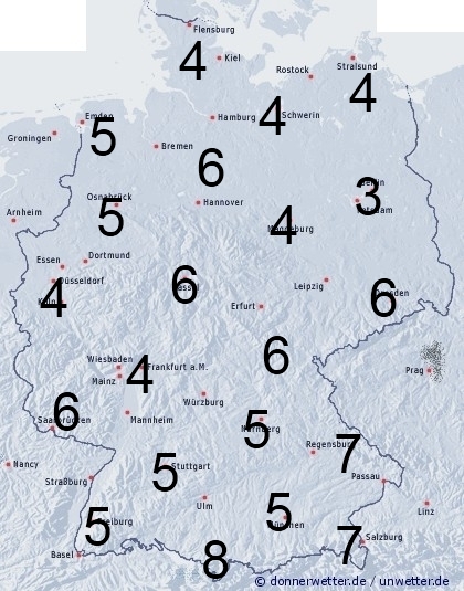 In Deutschland können sich im Tagesverlauf örtliche Schauer- und Gewittergüsse bilden. Sonst entsteht leichte Benetzung durch nächtlichen Strahlungstau. Die Benetzungsdauer liegt allgemein zwischen 3 und 7 Stunden. Bei Schauern können auch mehr erreicht werden.