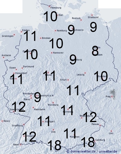 In Deutschland ist gebietsweise mit Regen oder Schauern zu rechnen. Sonst entsteht Benetzung durch nächtliche Feuchtigkeit, wie Tau oder Reifansatz.