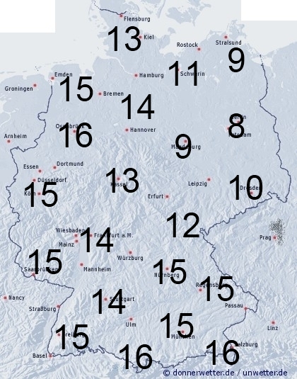 Letzer Regen entfernt sich nach Osten. Gleichzeitig zieht von Westen ein neues umfangreiches Regengebiet ins Land. Die Benetzungsdauer liegt allgemein in Deutschland zwischen 12 und 17 Stunden, im Nordosten nur zwischen 8 und 11 Stunden. Bei einer noch vorhandenen Schneedecke in den Bergen werden bis 24 Stunden erreicht.