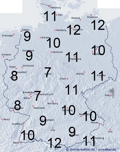 In Deutschland muss heute häufiger mit teils gewittrigen Regengüssen gerechnet werden. Sonst entsteht leichte Benetzung durch nächtlichen Strahlungstau. Die Benetzungsdauer liegt allgemein im Land zwischen 6 und 13 Stunden.