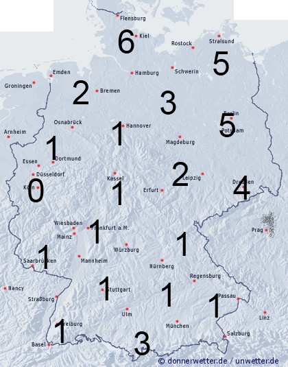 Die Benetzungsdauer liegt im Norden und Nordosten bei etwas Regen oder örtlichen Schauern zwischen 2 und 6 Stunden. Sonst entsteht nur durch nächtlichen Strahlungstau leichte Benetzung zwischen 0 und 3 Stunden