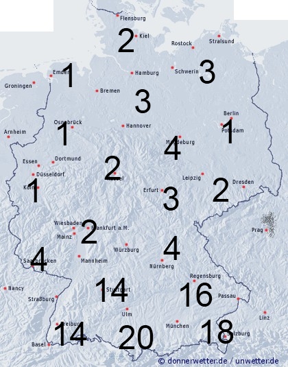 Vor allem im Süden fällt noch für längere Zeit Regen, daher liegt hier die Benetzungsdauer gebietsweise auch zwischen 14 und 20 Stunden. Sonst werden bei noch örtlichen Schauern meist zwischen 1 und 4 Stunden erreicht.