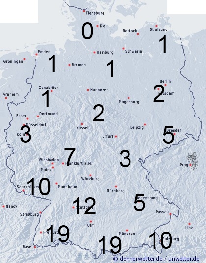 Im Süden liegt die Benetzungdauer durch Dauerregen zwischen 10 und 20 Stunden. In der Mitte und im östlichen Bayern können schauerbedingt zwischen 2 und 7 Stunden erreicht werden. Im Norden bleibt es in der Regel trocken. Daher gibt es hier auch kaum Benetzung.