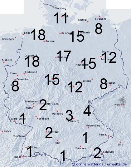 Im Norden fällt häufig Regen. Daher ist hier die Benetzungsdauer mit 8 bis 18 Stunden auch ziemlich hoch. Im Süden gibt es nur leichte Benetzung.