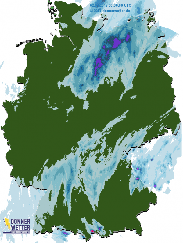 Das Radarbild zeigt aktuell am westlichen Bodensee und im südwestlichen Bayern noch einzelne Schauer- und Gewittersignale. Die Schauer über Sachsen sind mittlerweile schon nach Tschechien weitergezogen. Sonst ist es in Deutschland abgesehen vom Norden nur leicht bewölkt.