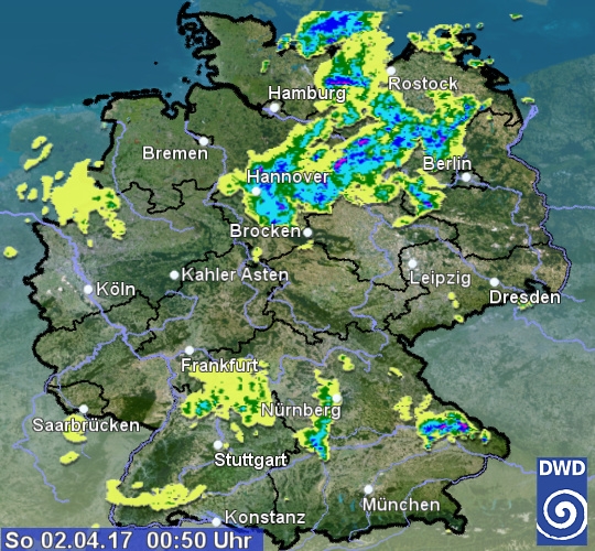 Das Radarbild zeigt aktuell zum Teil noch stärkere Schauer- und Gewitter Signale im östlichen Niedersachsens, sowie in Teilen Sachsen-Anhalts, Mecklenburg-Vorpommerns und Brandenburgs. Aber auch in Niederbayern erkennt man ein kleinräumigeres Schauer- und Gewitterfeld, das über den Bayrischen-Wald hinweg nach Tschechien zieht.