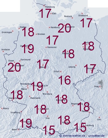 Die mittleren Temperaturen in 5 cm im Erdboden bewegen sich in Deutschland allgemein zwischen 17 und 20 Grad. In den Mittelgebirgen, sowie an den Alpen liegen die Werte teilweise noch unter 15 Grad.