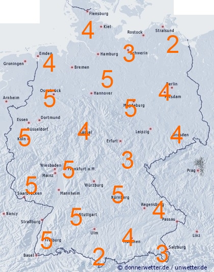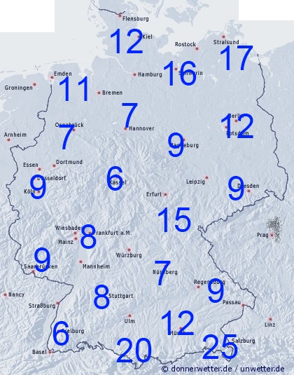 Ab Wochenmitte treten Schauer und Gewitter wieder häufiger auf. Bis zum Freitagabend ist in Deutschland mit durchschnittlichen Niederschlagsmengen von 5 bis 10 Litern pro Quadratmeter zu rechnen. Im Norden, sowie im Alpenvorland und auch bei kräftigen Schauern sind sicherlich auch deutlich größere Mengen zu erwarten.
