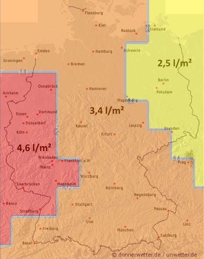 Dadurch erreichte die tatsächliche Verdunstung in diesen Gebieten knappe 5 Liter pro Quadratmeter, während diese unter anhaltender Bedeckung im Nordosten des Landes bei etwa der Hälfte lag.