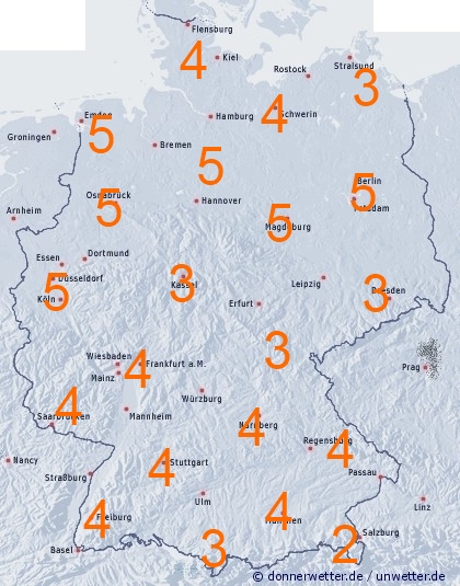 Die tägliche Verdunstung liegt in Deutschland meistens zwischen 3 und 5 Stunden, vereinzelt auch bei 6 Stunden. In den Mittelgebirgen und an den Alpen werden meist nur zwischen 2 und 3 Stunden erreicht.