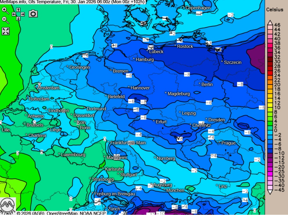 Die Temperaturen am Freitagmorgen (06:00 Uhr) nach GFS: