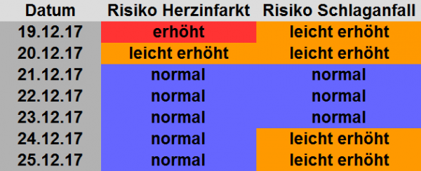 Mit dem Einzug milderer Temperaturen bewegen sich die Schlaganfall- und Herzinfarktrisiken in der zweiten Wochenhälfte auch meist normalem Niveau.