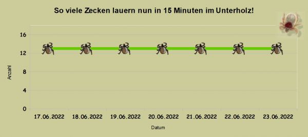 Im Gefahr aus dem Unterholz bleibt nach wie vor hoch - das sehr warme und in der neuen Woche auch zeitweise feuchte Wetter erhöht das Zeckenaufkommen auf 13 Exemplare in 15 Minuten.