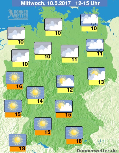 Heute Nachmittag strahlt im Süden und Westen verbreitet die Sonne von einem zumeist stahlblauen Himmel, dabei bleibt es trocken. Größtenteils dichte Wolken halten sich über dem Norden, Nordosten und Osten Deutschlands, dazu bilden sich von Brandenburg bis nach Mecklenburg-Vorpommern zeitweise Schauer, sonst bleibt es trocken. Die Temperatur steigt auf 10 bis 13 Grad im Norden und Osten, sonst auf 13 bis 18 Grad.