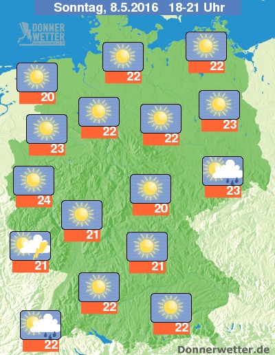 Heute Abend ist es weiterhin verbreitet sonnig und nur am Erzgebirge, am Alpenrand und am Schwarzwald sind vereinzelt Schauer und Gewitter möglich. Die Temperatur liegt bei frühsommerlich warmen 20 bis 24 Grad.