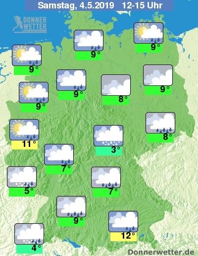 Heute Nachmittag halten sich überwiegend dichte Wolken und es können sich wiederholt Schauer bilden, zum Teil fällt dabei auch Schnee oder Graupel und es sind sogar kurze Gewitter möglich. Besonders im Norden zeigen sich jedoch auch gebietsweise Auflockerungen. Die Temperatur liegt bei nur 3 Grad am Thüringer Wald und bis 12 Grad in München.