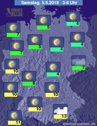 In der Nacht zum Samstag klart der Himmel auch über dem Süden meist auf, ganz am Alpenrand können sich noch dichtere Wolken halten, die hier aber kaum Niederschläge bringen, sonst ist es verbreitet sternenklar und trocken. Die Temperatur sinkt auf 13 Grad in München und bis 4 Grad an der Müritz.