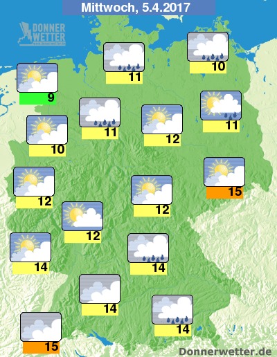 Am Sonntag ist dann auch im Norden die Sonne wieder häufiger mit von der Partie, Schauer bleiben die Ausnahme. Die Temperaturen erreichen im Tagesverlauf Höchstwerte um 12 Grad C in Berlin und um 21 Grad C im Breisgau.