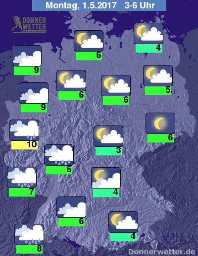 Zeitweiliger Sonnenschein ist zumindest am Vormittag noch im Nordosten zu erwarten, sonst dominieren jedoch eher dichte Wolken und dazu auch immer wieder Regenfälle. Die Temperaturen erreichen meist nur noch Werte zwischen 8 Grad in Niederbayern und bis 12 Grad im Rheinland. Im Osten und Nordosten wird es mit Werten bis 17 Grad deutlich wärmer.