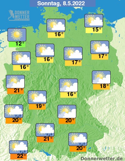 Am Sonntag ist es überwiegend heiter bis sonnig und dazu trocken, hier und da ziehen jedoch auch einige Wolken durch. Im Süden bilden sich bei zum Teil dichten Wolken lokale Schauer. Die Temperatur steigt auf 12 Grad an der Nordsee und bis 22 Grad am Oberrhein.