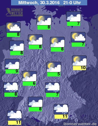 Heute Abend fällt im Süden und Südwesten unter dichten Wolken weiterhin zeitweise Regen, auch im Westen halten sich meist dichte Wolken, hier bleibt es jedoch weitgehend trocken. Im übrigen Land ist es oft aufgelockert, teils aber auch stark bewölkt, dazu bleibt es aber trocken. Die Abendtemperatur liegt bei 11 Grad in Freiburg und um 5 Grad im Eichsfeld.