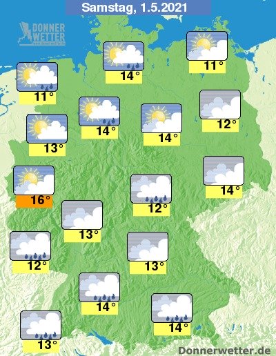Am Samstag ziehen zumeist dichte Wolken durch, im Norden und Westen ist es auch gebietsweise heiter. Es können sich landesweit vereinzelte Schauer bilden. Die Temperatur steigt auf 11 Grad an der Ostsee und bis 16 Grad im Rheinland.