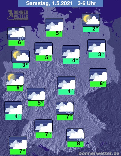 In der kommenden Nacht bleibt der Himmel verbreitet wolkenverhangen. Auflockerungen sind im Norden und Westen Deutschlands aber möglich. Im Alpenvorland und an der Nordsee fällt örtlich noch etwas Regen, sonst bleibt es trocken bei Tiefstwerten von 8 Grad in München und bis 2 Grad an der Müritz.