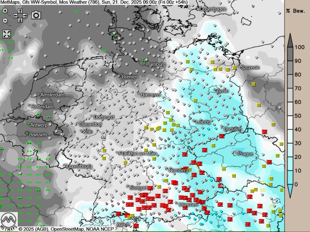 Am Sonntag zeigt sich der Himmel über weiten Landesteilen wechselnd oder stark bewölkt, lokal ist es auch längere Zeit neblig-trüb. Größere Auflockerungen beschränken sich vor allem auf die Höhen der Mittelgebirge und den Alpenrand. Es bleibt niederschlagsfrei.