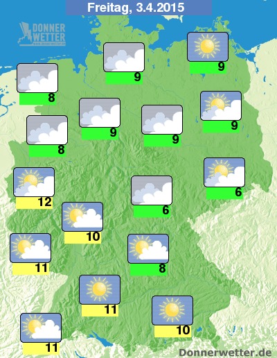 Heute halten sich von der breiten Mitte bis in den Norden des Landes oft dichte Wolken, gebietsweise und vor allem nach Nordosten hin kann sich die Wolkendecke aber lösen und der Sonne Platz machen. Weiter nach Süden hin ist es verbreitet heiter oder sogar sonnig. Gebietsweise ziehen aber auch hier mal mehr Wolken durch. Es bleibt landesweit trocken. Die Höchstwerte erreichen 6 Grad im Vogtland und etwa 12 Grad in der Kölner Bucht.