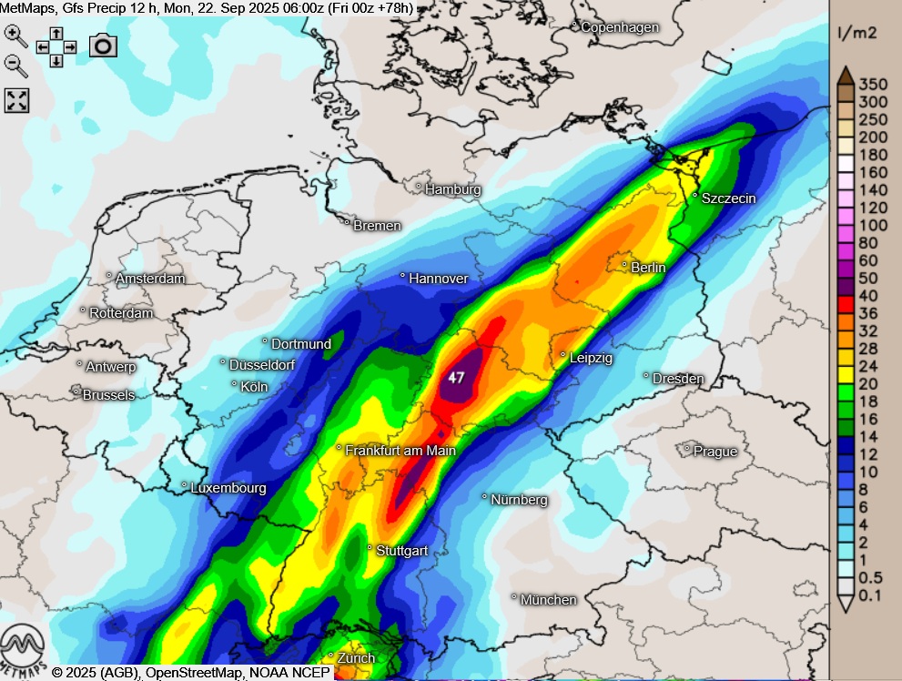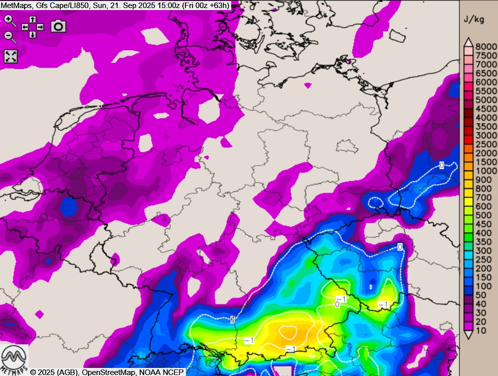 Die Cape/Lifted-Karte für Sonntagnachmittag (15:00 Uhr) sowie die 12-Stunden-Regenmengen bis Montag 06:00 Uhr nach GFS:
