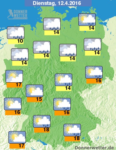 Am Dienstag ist es im Süden und Südwesten teils heiter, teils ziehen hier einige Quellwolken durch, dabei besteht ein leichtes Schauer- und Gewitterrisiko, im übrigen Bundesgebiet ziehen oft dichte Wolken durch und es fällt zeitweise Regen. Die Temperatur steigt auf 10 bis 18 Grad.