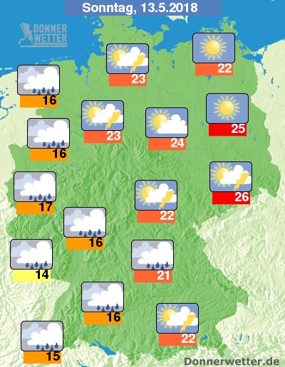 Am Sonntag bilden sich in einem breiten Streifen von Bayern bis zur Nordsee immer wieder Schauer und örtliche Gewitter, südwestlich davon fällt bei ebenfalls meist dichten Wolken zeitweise Regen. Nordöstlich des Streifens scheint dagegen die Sonne von einem meist wolkenlosen Himmel und es bleibt trocken. Die Temperatur erreicht 14 Grad im Saargau und bis 26 Grad in der Lausitz.