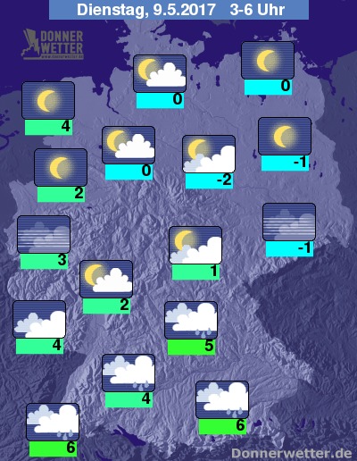 In der folgenden Nacht bleibt es über dem Süden weitgehend bedeckt, hier fällt zeitweise Regen. Sonst lockert und klart der Himmel von Norden her mehr und mehr auf und es bleibt trocken. Die Temperatur sinkt auf 6 Grad in Augsburg und bis auf frostige -3 Grad rund um Magdeburg.