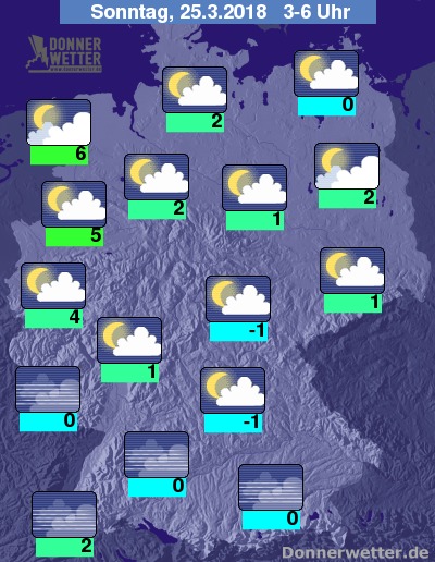 In der bevorstehenden Nacht können im Umfeld der Nordsee teils dichte Wolken mit vereinzelt ein paar Regentropfen durchziehen, sonst ist es vom Norden bis zur breiten Landesmitte weitgehend leicht bis aufgelockert bewölkt und trocken. Im Süden und Südwesten bleibt es sogar verbreitet sternenklar. Die Temperatur sinkt auf 6 Grad in Emden und bis -1 Grad in Mittelfranken.