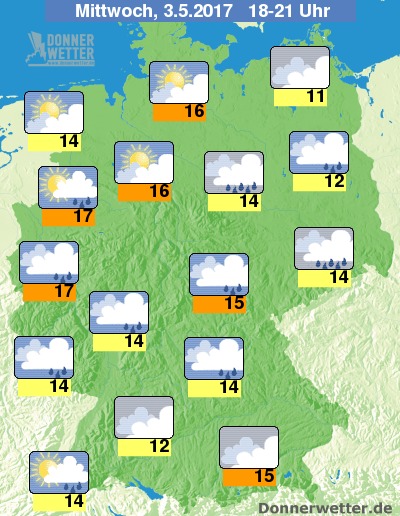 Heute Abend lockert es im Norden und Nordwesten Deutschland meist etwas auf, dazu bleibt es hier meist trocken. Im übrigen Bundesgebiet ziehen jedoch mehrheitlich dichte Wolken durch und es fällt auch immer wieder Regen. Kurze Auflockerungen bleiben aber möglich. Die Temperatur liegt bei 11 bis 17 Grad.