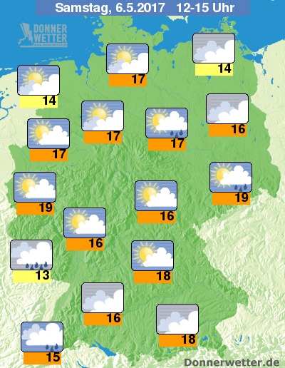 Heute Nachmittag ziehen über den Osten sowie über den Südwesten kompakte Wolken mit gebietsweisen Regenfällen hinweg. In einem sehr breiten Streifen von Nordwest- nach Südostdeutschland scheint zwischen meist nur lockeren Wolken hingegen häufig die Sonne und es bleibt dazu trocken. Im Norden und Nordosten ist es zwar mehrheitlich stark bewölkt, jedoch zumindest weitgehend trocken. Die Temperatur liegt bei 13 Grad am Pfälzer Wald und etwa 19 Grad im Rheinland.