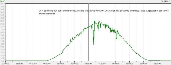 Die UVA-Strahlung befindet sich nun auf Sommerniveau -  das zeigt unter anderem unsere Messkurve vom 30.04.2017 mit einer Strahlung von fast 30 W/m² am Mittag. Auch an diesem Samstag ist ein ausreichender UV-Schutz wärmstens zu empfehlen!