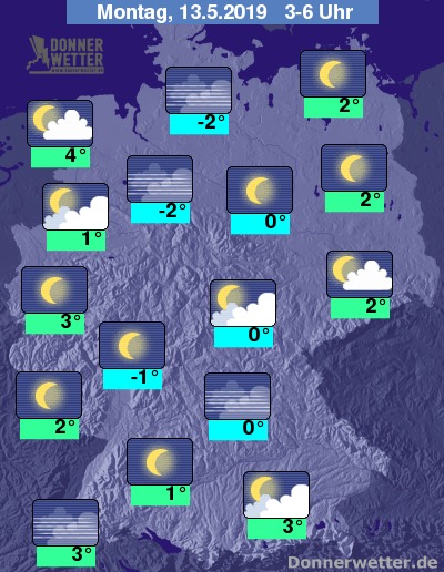 In der Nacht zum Montag klingen die letzten Regenfälle am Alpenrand bald ab, sonst ist es schon verbreitet locker bewölkt und häufig auch sternenklar, dazu bleibt es trocken. Die Temperatur sinkt auf 4 Grad an der Nordsee und bis -2 Grad entlang der Oberen Weser.
