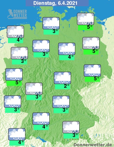 Heute zieht aufgelockerte oder dichte Bewölkung durch, dabei bilden sich häufig Regen-, Schneeregen-, Schnee-, oder Graupelschauer, örtlich sind auch Gewitter möglich. Es weht ein oft starker Wind, an der See herrscht zum Teil Sturm. Die Temperatur steigt auf 2 Grad im Thüringer Becken und bis 5 Grad im Rheinland.