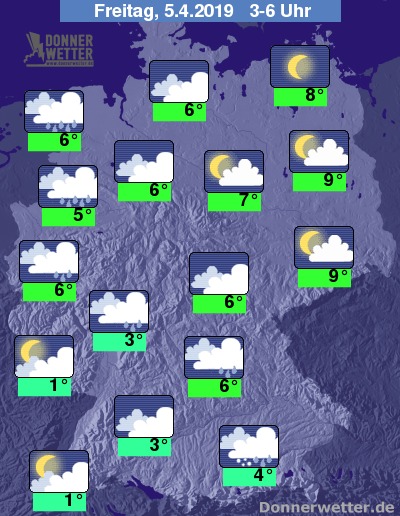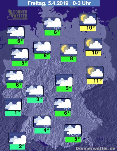 In der Nacht bleibt der Himmel über weiten Teilen des Landes bedeckt, lockere Wolken überwiegen nur entlang der Oder sowie im äußersten Südwesten. An der Ostseeküste kann es im Nachtverlauf auch aufklaren. Im Süden und Westen Deutschland können in den kommenden Stunden immer wieder Schauer fallen, am Alpenrand auch Schneeregen oder Schnee.