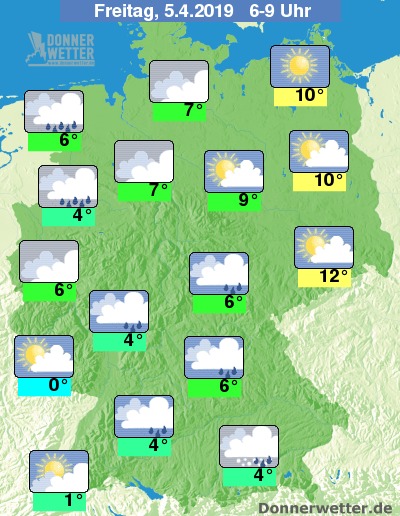 Der Freitag startet östlich der Elbe sowie zwischen Mosel und Breisgau mit einem trockenen Mix aus Sonne und Wolken, an der Ostseeküste scheint die Sonne meist sogar von einem wolkenlosen Himmel. In den übrigen Landesteilen bleibt der Himmel meist bedeckt, dabei fällt vor allem im Süden und Nordwesten zeitweise Regen.