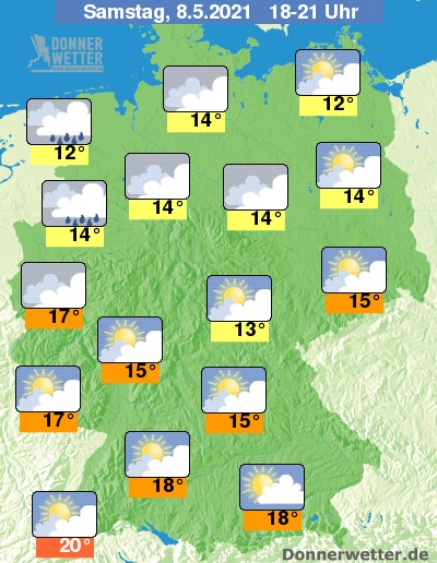 Heute Abend ist es über dem Norden und Westen meist bedeckt und vom Niederrhein bis zur Ems fällt gebietsweise auch Regen, sonst bleibt es trocken. Im Osten ist es meist aufgelockert bewölkt und trocken, im Süden häufig heiter, teils auch stärker bewölkt, jedoch ebenfalls trocken. Die Temperatur liegt bei 12 Grad in Rostock und bis 20 Grad in Freiburg.