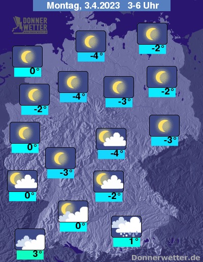In der Nacht zum Montag sind am Alpenrand unter meist dichten Wolken noch einige Flocken möglich. Im übrigen Bundesgebiet zeigt sich der Himmel größtenteils sternenklar oder es zieht nur lockere Bewölkung durch, dazu bleibt es trocken. Die Temperatur sinkt auf 3 Grad in Freiburg und bis -4 Grad in Hannover.