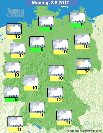 Vor allem südlich der Donau halten sich kompakte Schichtwolken mit teils kräftigem Regen. In der kommenden Nacht sinkt die Schneefallgrenze auf etwa 1000 m. Sonst dominieren zwar auch die Wolken, leichter Regen, oder Schauer treten aber nur gebietsweise auf. In den Hochlagen der Mittelgebirge können sich auch Schneeflocken, oder Graupelkörner unter die Tropfen mischen. Im Norden heitert es im Tagesverlauf zunehmend auf. Die Höchsttemperaturen fallen mit 8 bis 15 Grad nicht „Wonnemonat“ tauglich aus. Achtung, in der Nacht auf Dienstag muss bei längerem Aufklaren in der Nordhälfte mit leichtem Frost gerechnet werden.