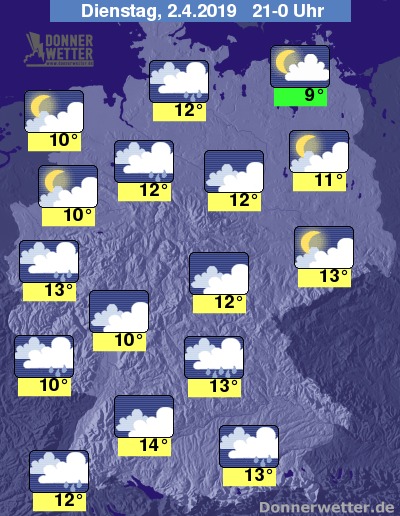 Bis Mitternacht bleibt es im Nordosten und Osten meistens trocken, sonst wechseln sich dichtere Wolken mit Sternen ab. Örtlich gehen Schauer nieder.